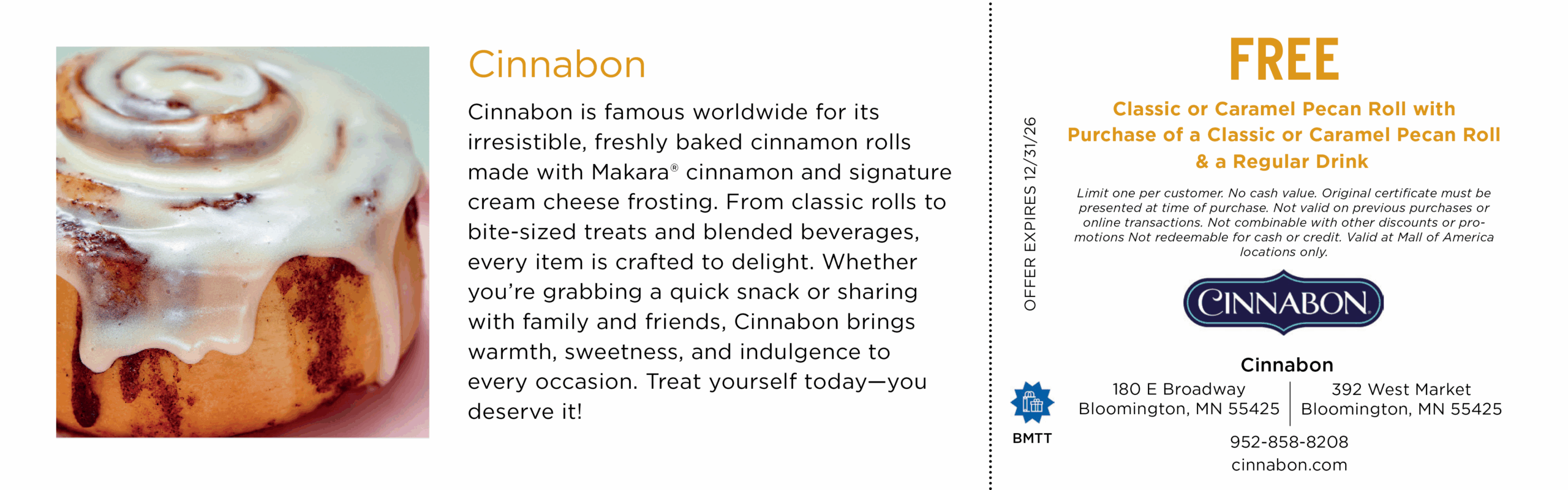 Limit one per customer. No cash value. Original certificate must be presented at time of purchase. Not valid on previous or online transactions. Not combinable with other discounts or promotions. Not redeemable for cash or credit. Valid at Mall of America locations only.